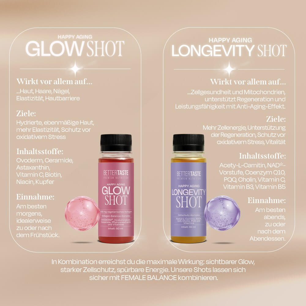 Der GLOW SHOT kombiniert moderne Inhaltsstoffe wie Ovoderm®, Hyaluronsäure, Astaxanthin und Ceramide aus mit ausgewählten Mikronährstoffen, um die Haut von innen heraus zu unterstützen – als Teil einer langfristig gedachten Routine.