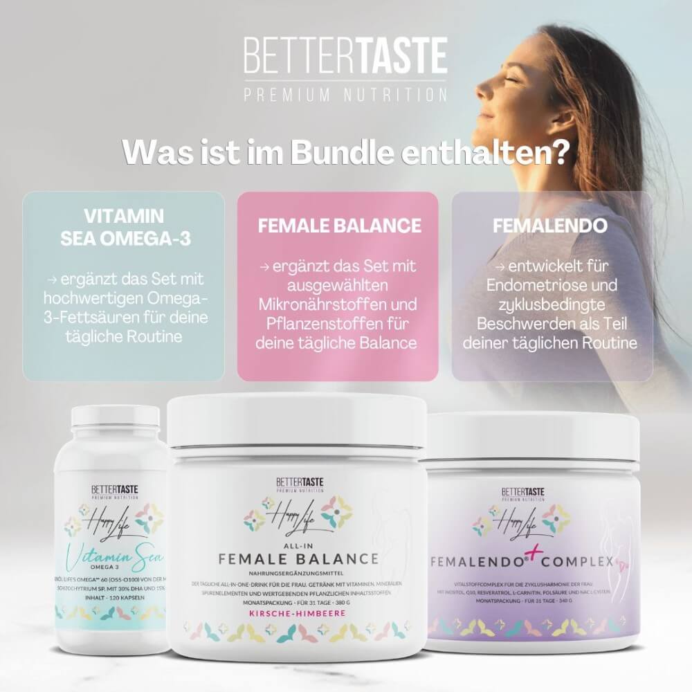 HAPPY LIFE FEMALENDO COMPLEX, FEMALE BALANCE COMPLEX & VITAMIN SEA BUNDLE – Für alle, die ihre tägliche Routine bei Endometriose gezielt ergänzen und ihren Körper bewusster begleiten möchten.