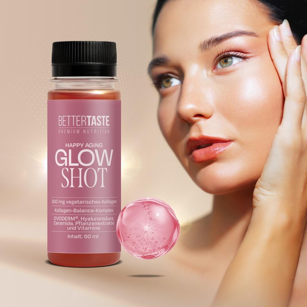 Der GLOW SHOT kombiniert moderne Inhaltsstoffe wie Ovoderm®, Hyaluronsäure, Astaxanthin und Ceramide aus mit ausgewählten Mikronährstoffen, um die Haut von innen heraus zu unterstützen – als Teil einer langfristig gedachten Routine.