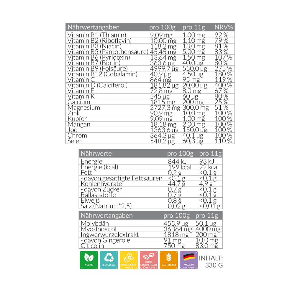 Wir haben die Dosierung der Inhaltsstoffe perfekt auf deinen täglichen Bedarf an essenziellen Mikronährstoffen abgestimmt und penibel genau darauf geachtet, dass sich die Inhaltsstoffe gegenseitig ergänzen und unterstützen.