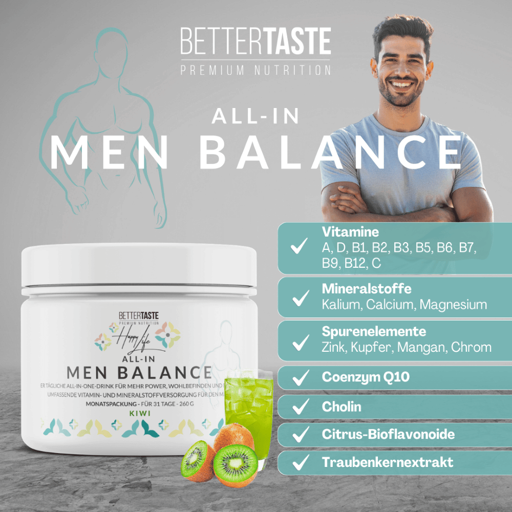 HAPPY LIFE - ALL IN MEN BALANCE – Nahrungsergänzungsmittel - Der tägliche ALL-IN-ONE-DRINK für mehr Power, Wohlbefinden und Dynamik für den Mann.