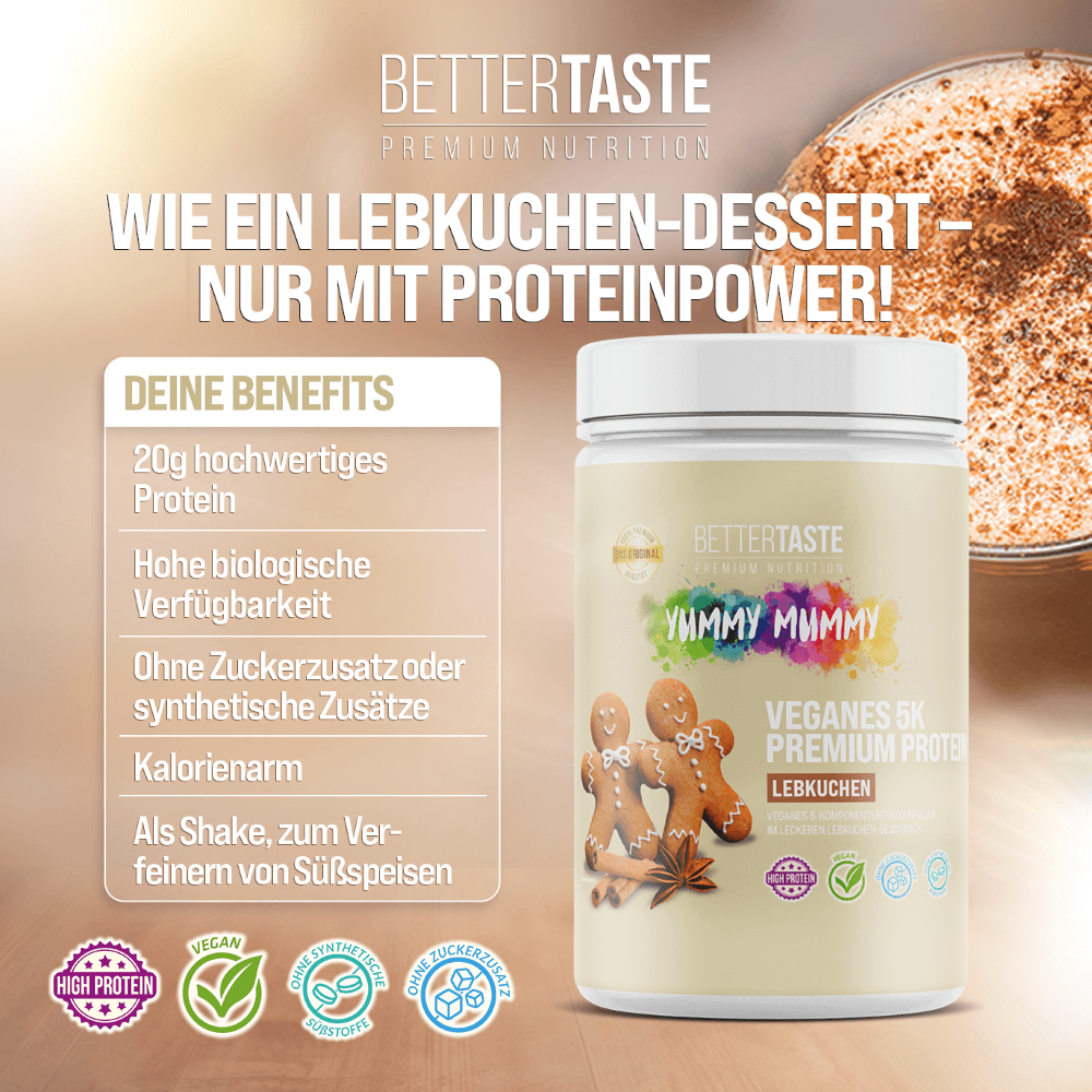 Das YUMMY MUMMY VEGAN 5K PREMIUM PROTEIN LEBKUCHEN liefert dir über 20g Proteine pro Portion aus 5 verschiedenen Eiweißquellen. Durch die optimale Zusammensetzung hat es eine sehr hohe biologische Verfügbarkeit.